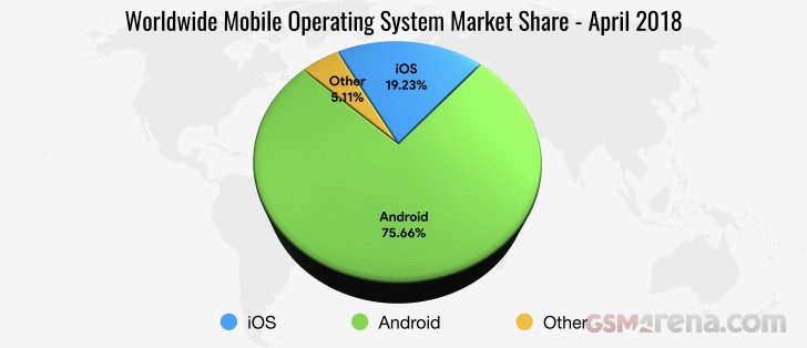 In 2011, Android became the world's most popular mobile Operating System - a mantle that it has not relinquished since - and is unlikely to do so as developing a modern OS for any platform is a major undertaking. As of April 2018, Android had a market share of 75.66%, with iOS holding 19.23%. The 5.11% for 'other' combines the likes of Windows, Series 40, Samsung, and Blackberry. Taking tablets into account, iOS only closes the divide by 2-3%.